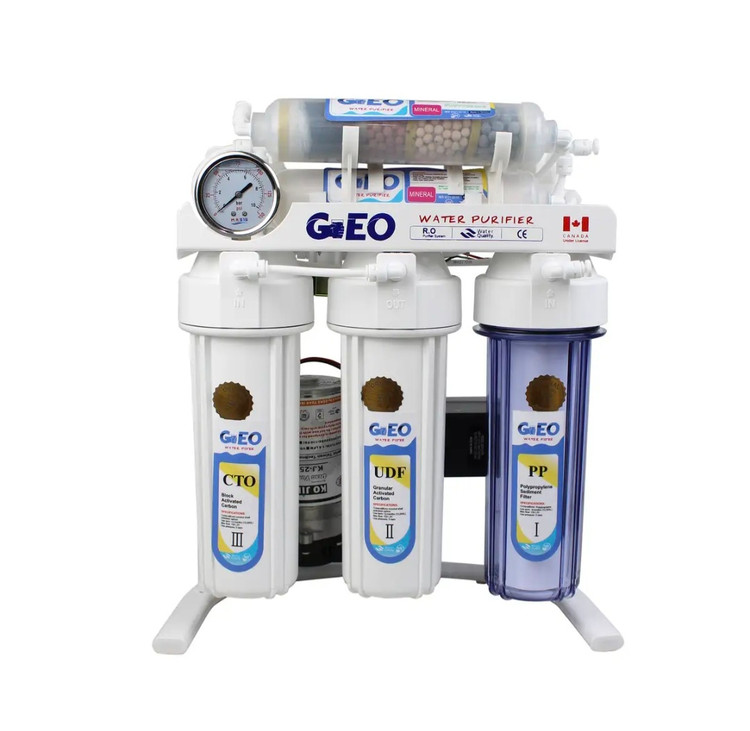 دستگاه تصفیه آب 7 مرحله GEO املاح، باکتریها، قارچ ها و کلر را از آب میگیرد و درنتیجه آب آشامیدنیتان کاملاً پاکسازی میشود. آب غیراستاندارد در درازمدت میتواند باعث آسیب به کلیهها شود؛ و همچنین برخی املاح در آب سرطانزا است.